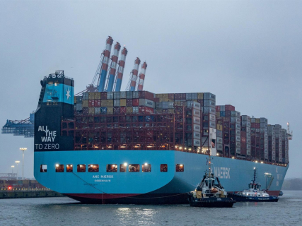 28 March 2024, Hamburg, Hsmburg: The world's first large methanol container ship, the "Ane Maersk" from shipping company Maersk, docks at the Eurogate container terminal in the Port of Hamburg. Axel Heimken/dpa
