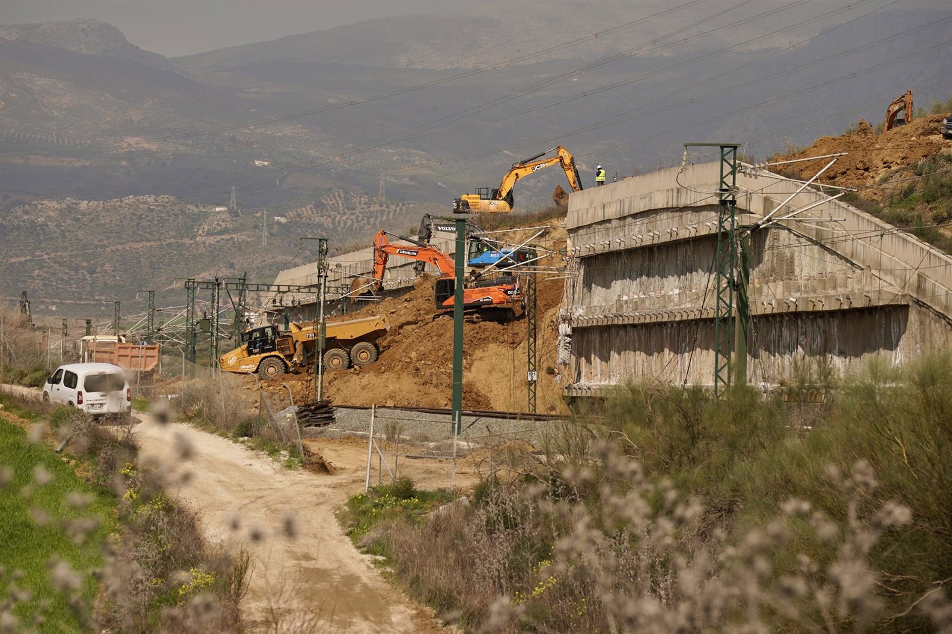 Imágenes de los trabajos que se están llevando a cabo en la vía de Alta Velocidad que une Málaga con Madrid tras la caída de un muro de contención de cinco metros a la altura del municipio malagueño de Álora. Álex Zea - Europa Press