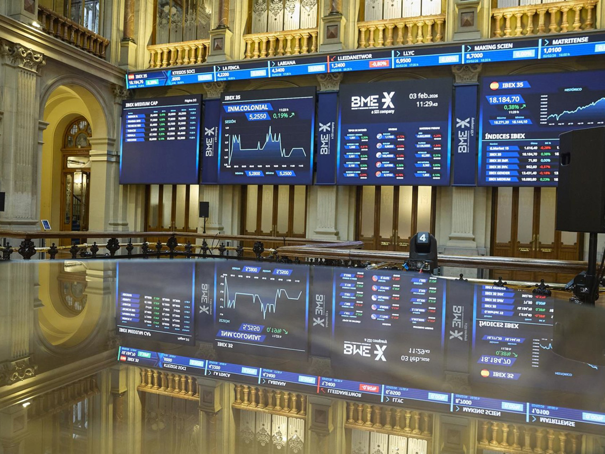 Paneles informativos en el Palacio de la Bolsa de Madrid, a 3 de febrero de 2026, en Madrid (España).  Jesús Hellín - Europa Press