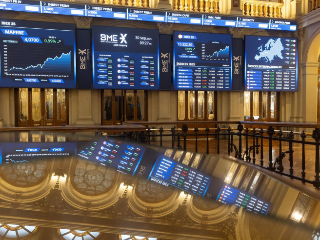 Paneles digitales en el Palacio de la Bolsa de Madrid, a 30 de septiembre de 2025, en Madrid (España). Eduardo Parra - Europa Press