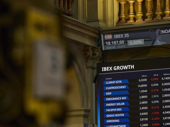 Un panel informativo en el Palacio de la Bolsa de Madrid, a 3 de febrero de 2026, en Madrid (España). Jesús Hellín - Europa Press