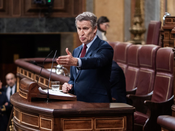 El presidente del Partido Popular, Alberto Núñez Feijóo, interviene durante una sesión de control al Gobierno, en el Congreso, a 25 de marzo de 2026, en Madrid (España). César Vallejo Rodríguez - Europa Press