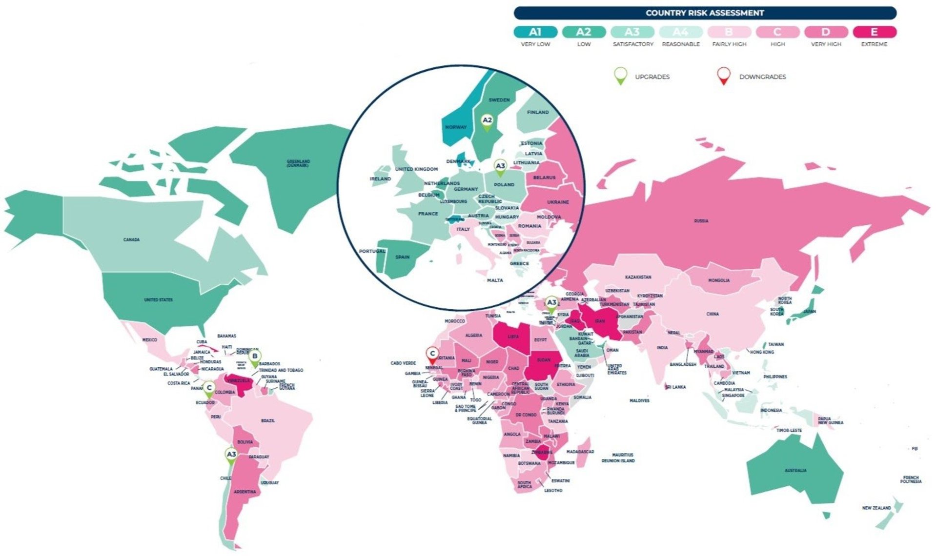 Para clasificar a los países, los analistas de Coface han definido ocho escalones de riesgo: A1 "muy bajo" (países con menos riesgo), A2 "bajo", A3 "satisfactorio", A4 "razonable", B "razonablemente alto", C "alto", D "muy alto" y E "extremo" (países con más riesgo).