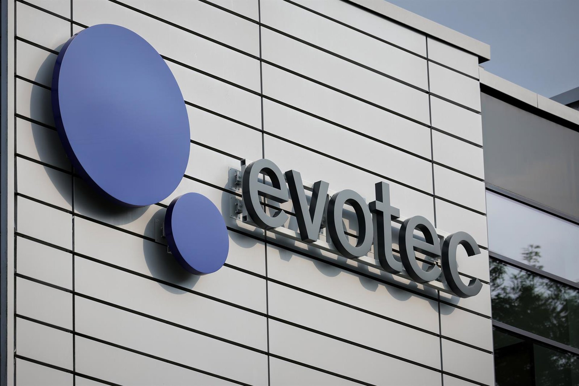FILED - 30 August 2023, Hamburg: A general view of Evotec SE's logo at its headquarters. Photo: Christian Charisius/dpa Christian Charisius/dpa