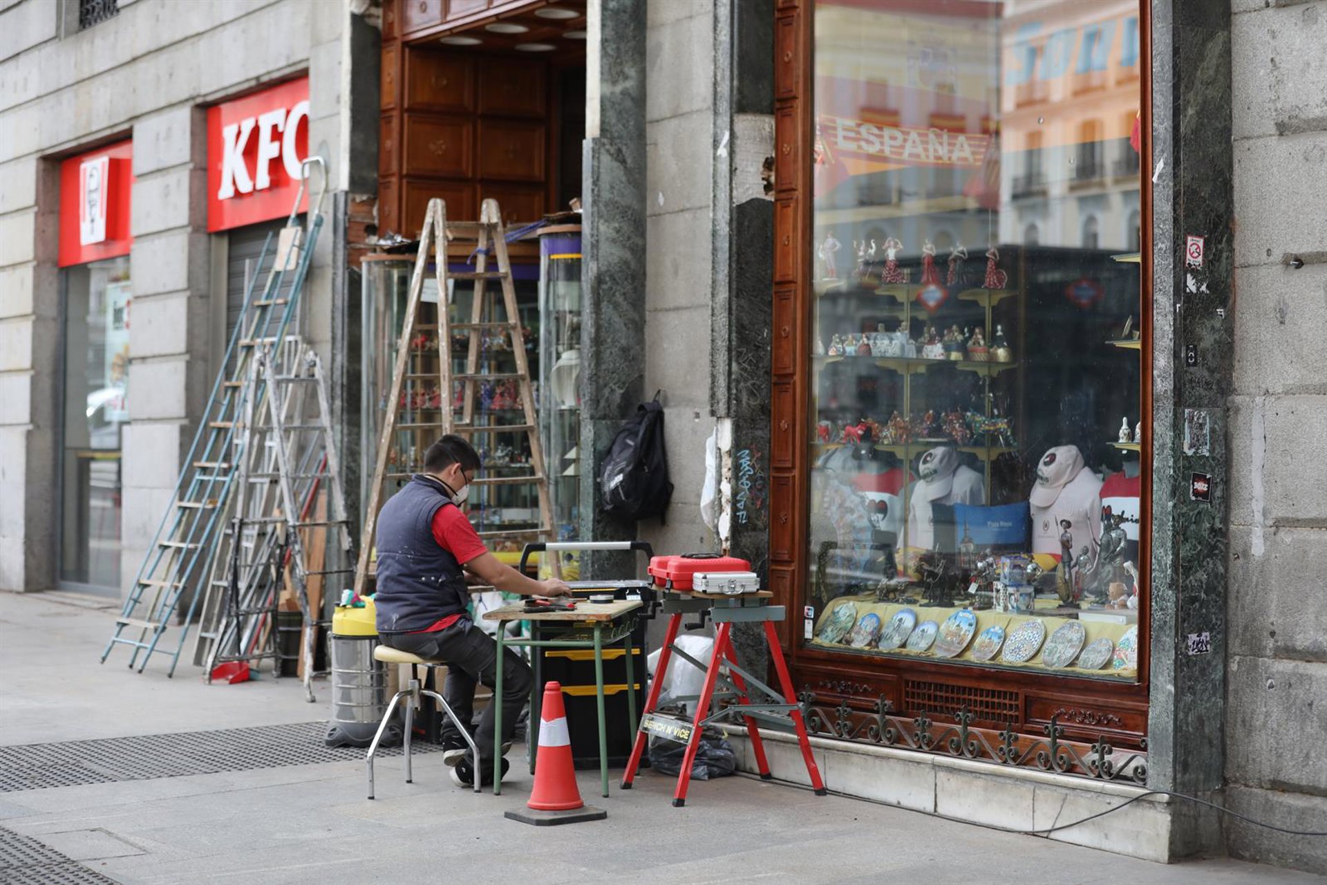 Un hombre protegido con mascarilla trabaja en la puerta de su ferretería Marta Fernández Jara - Europa Press