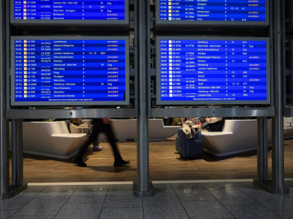 People sit in a waiting area behind display boards showing cancelled flights at Frankfurt Airport on the second day of strikes by the cabin crew union Ufo, while the pilots' union VC has announced full-day strikes at Lufthansa. Hannes P. Albert/dpa