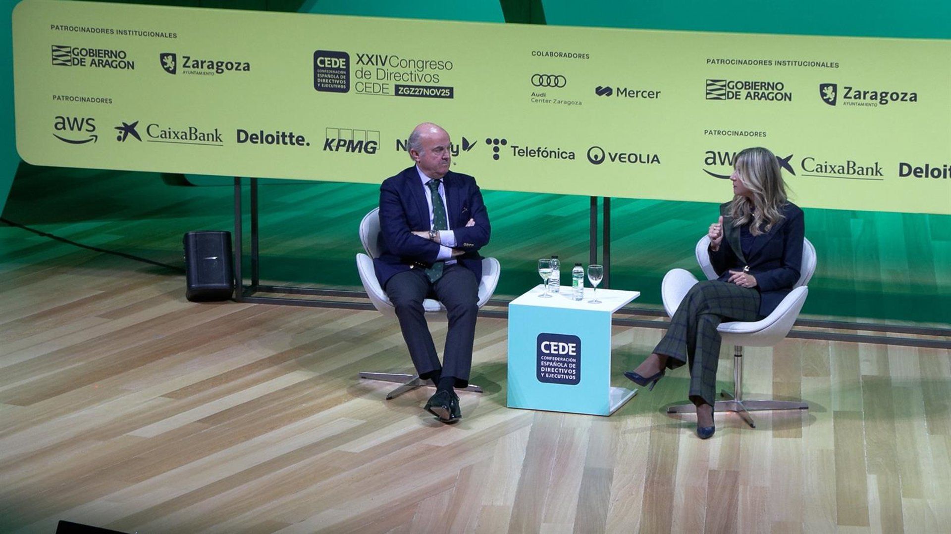 Durante su participación en el XXIV Congreso de Directivos CEDE en Zaragoza, De Guindos enfatizó la necesidad de aumentar la inversión en servicios sociales para prevenir enfoques populistas y fragmentación social, adaptando los recursos en educación y sanidad al crecimiento demográfico.