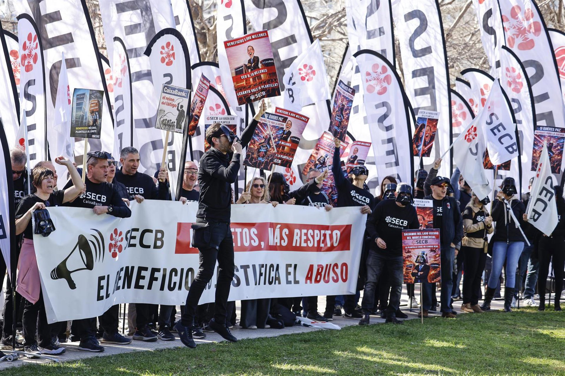 Los sindicatos con representación en CaixaBank se han concentrado este viernes frente al Palacio de Congresos de València, sede de la Junta General Ordinaria de Accionistas de la entidad, para denunciar la “exigencia comercial que asfixia a la plantilla” y reclamar “una negociación real que permita introducir cambios estructurales en el modelo de exigencia y la organización del trabajo”.