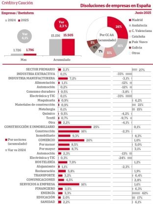 En cuanto a las disoluciones, los datos de junio reflejan un aumento del 4,1% en comparación con el mismo mes del año anterior, totalizando 1.796, mientras que el acumulado anual muestra un incremento del 2,3%, con 15.505 disoluciones registradas.
