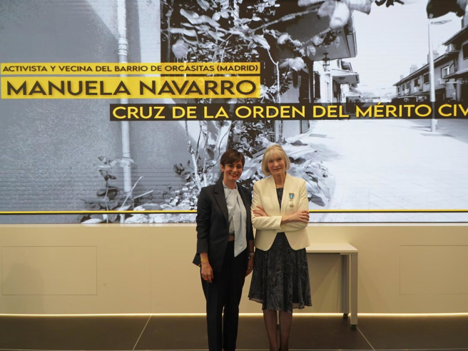 La ministra de Vivienda y Agenda Urbana, Isabel Rodríguez, ha impuesto este martes la Cruz de la Orden del Mérito Civil a Manuela Navarro, vecina del barrio madrileño de Orcasitas, en reconocimiento a su trayectoria en la defensa del derecho a la vivienda.
