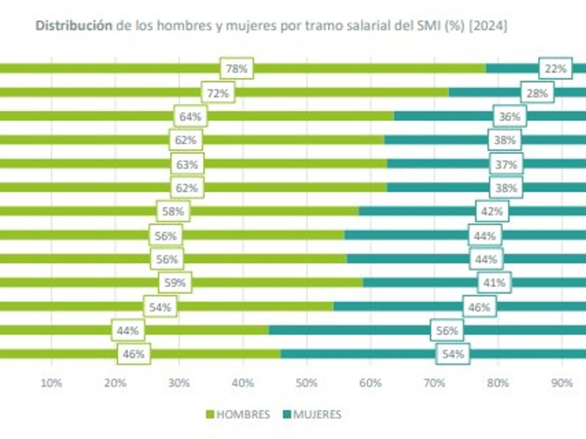 En el extremo contrario, solo el 1,8% de las mujeres ocupadas gana más de cinco veces el SMI, frente al 3,2% de los hombres. “Tres de cada cuatro personas que cobran al menos 7,5 veces el SMI son hombres, mientras que las mujeres solo son mayoría en los salarios más pobres, por debajo del SMI”, ha apuntado Pérez.