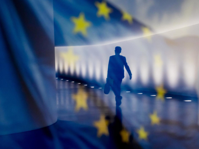 Reflejo de una persona junto a una bandera de la Unión Europea (UE). Christoph Soeder/dpa