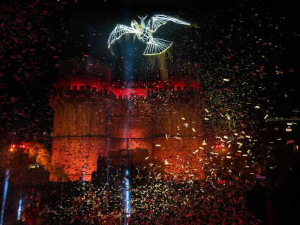 Actuación durante la Crida de las Fallas 2025, en las Torres de Serranos, a 22 de febrero de 2026, en Valencia, Comunidad Valenciana (España). Eduardo Manzana - Europa Press