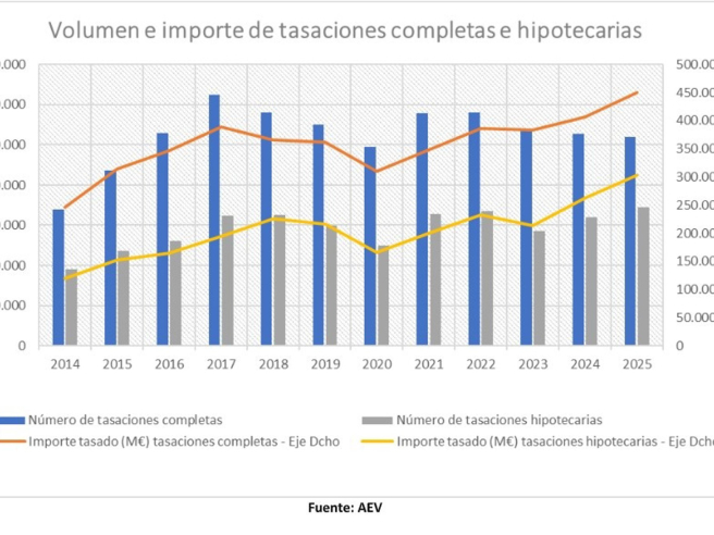 Según explicó el secretario general de la AEV, Jorge Dolç, 2025 estuvo marcado por el "fuerte dinamismo de la tasación hipotecaria residencial", consolidada como principal motor de la actividad, junto a las primeras señales de recuperación en la promoción y una creciente concentración del mercado en áreas urbanas.