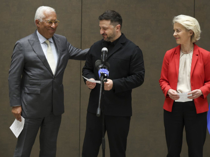 El presidente de Ucrania, Volodimir Zelenski, junto al presidente del Consejo Europeo, António Costa, y la presidenta de la Comisión Europea, Ursula von der Leyen. ALEXANDROS MICHAILIDIS / EUROPEAN COUNCIL