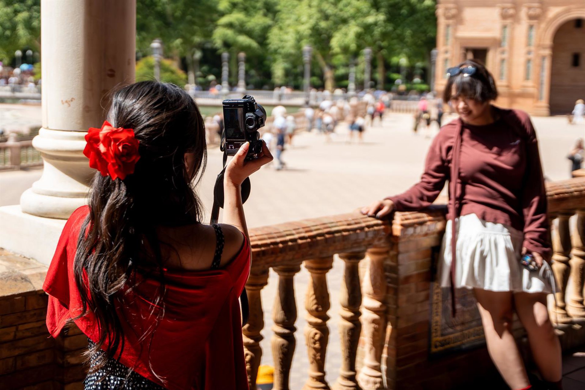 Los turistas contemplan la Plaza de España de Sevilla en una jornada primaveral. A 17 de abril de 2026 en Sevilla (Andalucía. España). Eduardo Briones - Europa Press