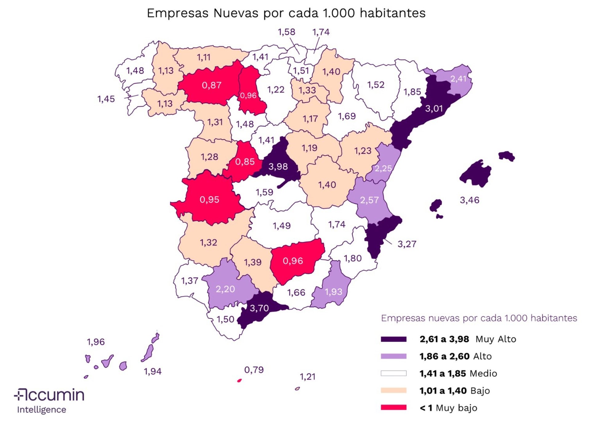 Madrid, Málaga y las Islas Baleares figuran entre las provincias españolas con una "alta intensidad emprendedora", al registrar un "elevado" volumen de compañías de nueva creación por cada 1.000 residentes, de acuerdo con un comunicado difundido este martes por Accumin Intelligence, la división de inteligencia de datos de Accumin.