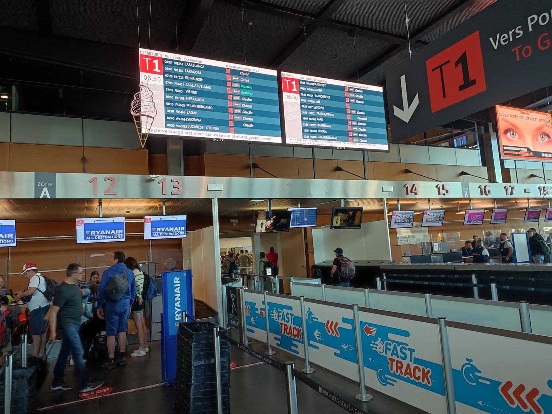 15 July 2023, Belgium, Charleroi: A picture shows, the situation at the start of a strike of pilots of low cost airline Ryanair, at Charleroi Airport. Photo: Mathieu Colinet/Belga/dpa Mathieu Colinet/Belga/Dpa