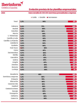 Solo el 15% de las empresas españolas prevé incrementos en su plantilla en 2026, según Iberinform. IBERINFORM