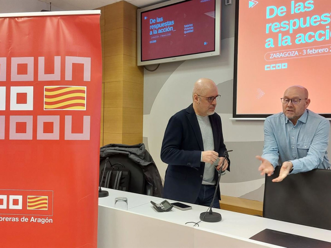 El secretario general de CCOO, Unai Sordo, junto a su homólogo en Aragón, Manuel Pina. EUROPA PRESS