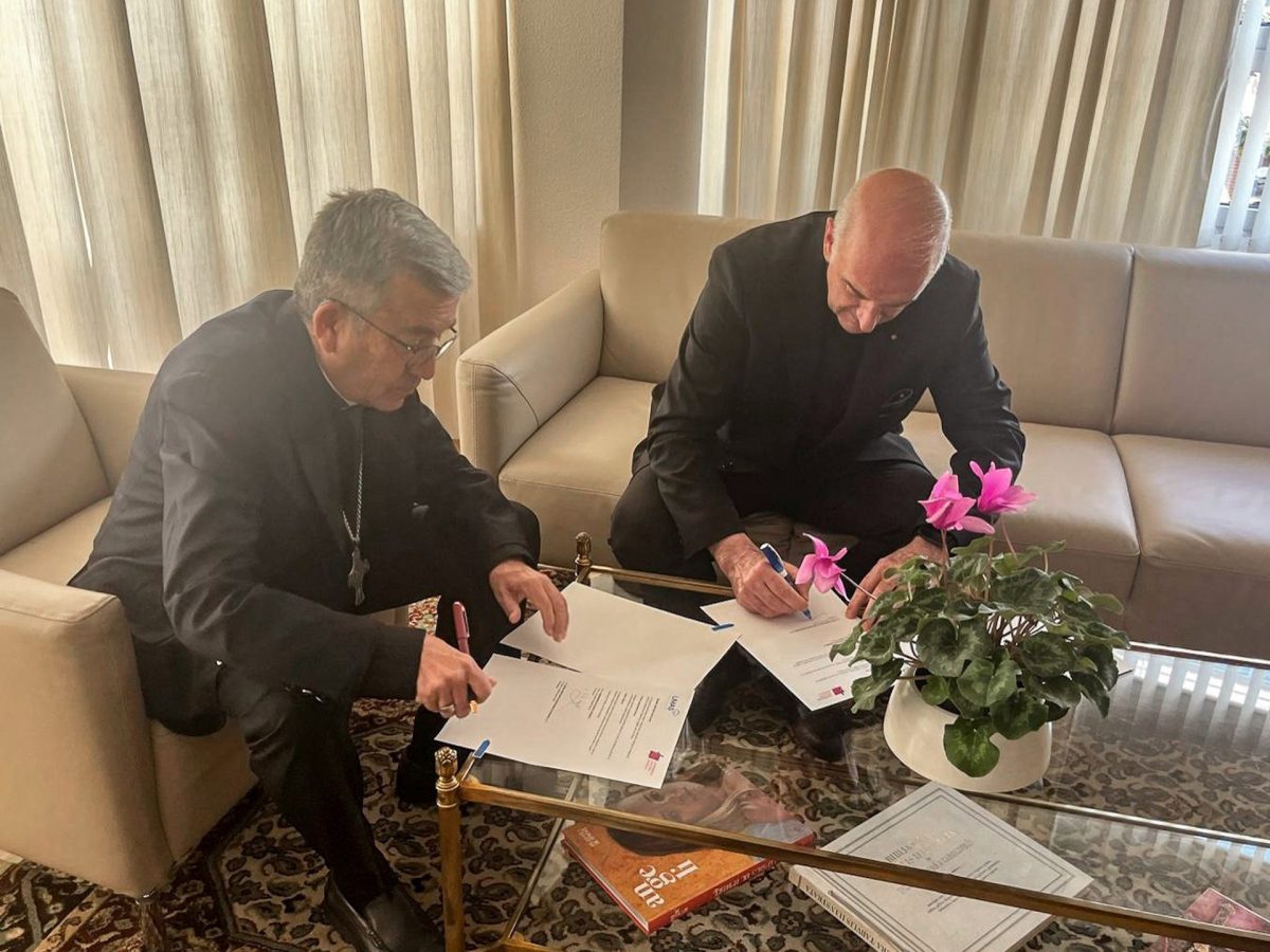 Firma de un acuerdo entre el presidente de la Conferencia Episcopal Española, Luis Argüello, y el presidente de UMAS Seguros, Carlos Ayerra Sola, por el que acuerdan que UMAS sea la aseguradora oficial de la visita del Papa a España. UMAS