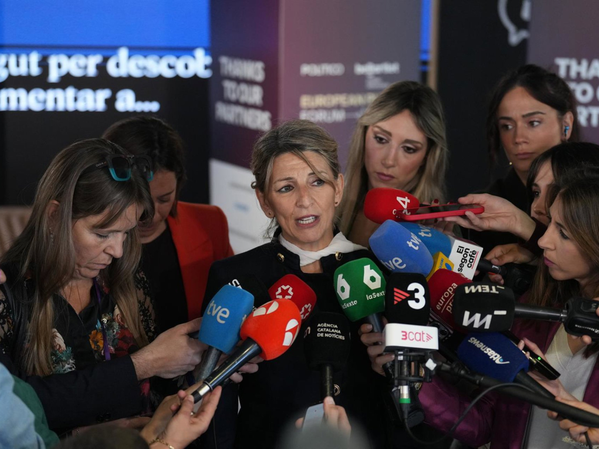 La vicepresidenta segunda y ministra de Trabajo y Economía Social, Yolanda Díaz, atiende a los medios durante el European Pulse Forum 2026, a 10 de abril de 2026, en Barcelona, Catalunya (España). David Zorrakino - Europa Press