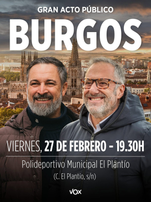 Cartel del acto electoral de Santiago Abascal y Carlos Pollán el viernes 27 de febrero en Burgos VOX