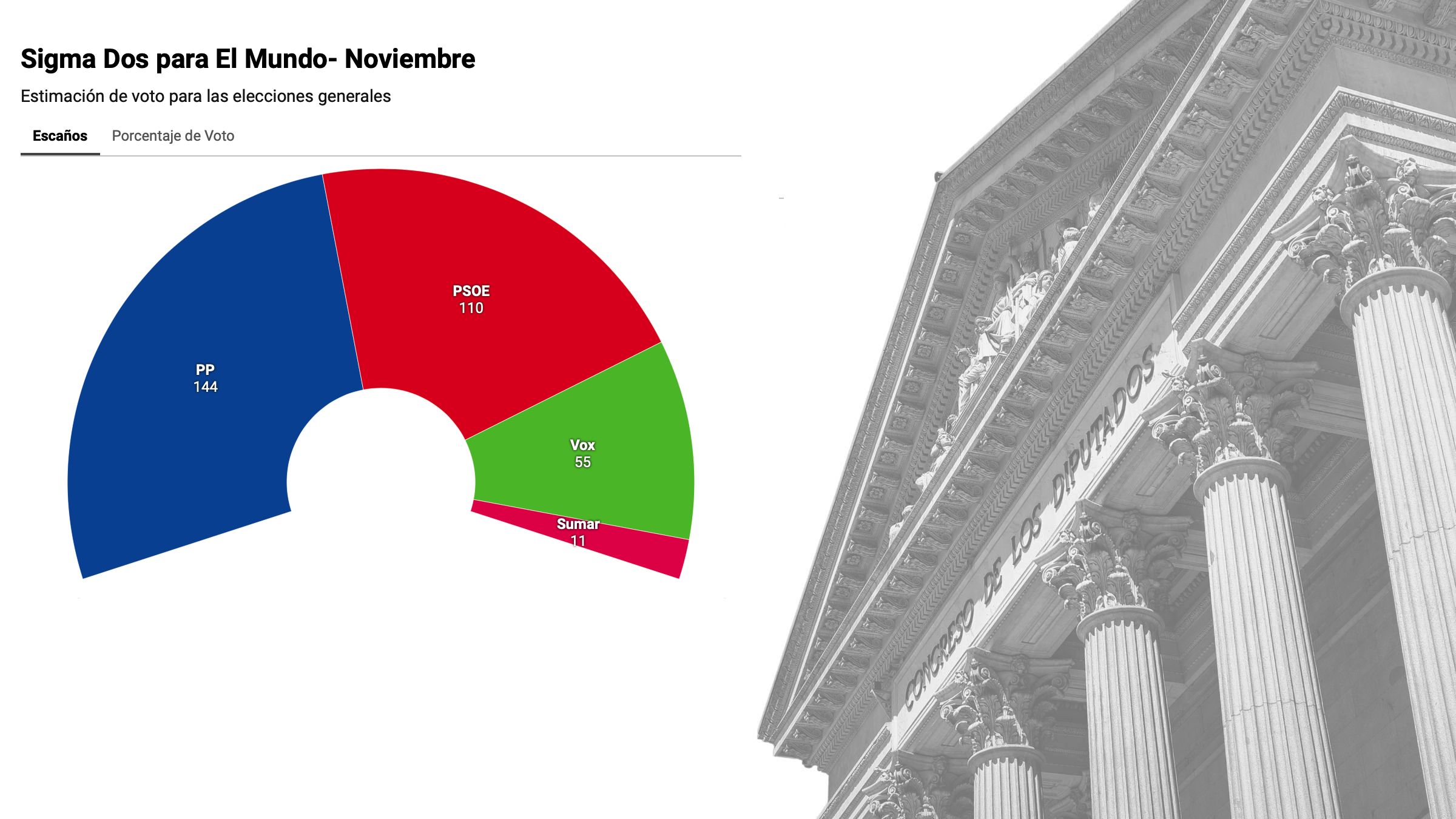 El último panel de Sigma Dos para El Mundo, correspondiente a noviembre, confirma el liderazgo del PP, que sube al 33,6 % y lograría 144 escaños, 7 más que en las elecciones de 2023. El PSOE baja al 27,4% (110 diputados) mientras que Vox marca su mejor registro del año con el 16,2 % (55). Sumar cae al 7,5%, mientras Podemos retrocede al 4,2%.