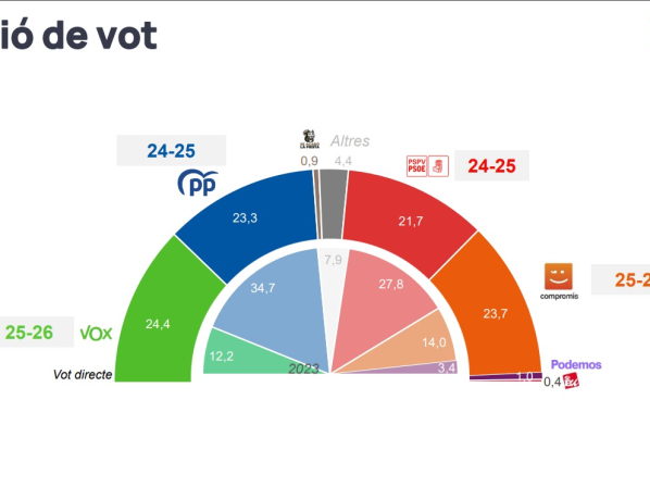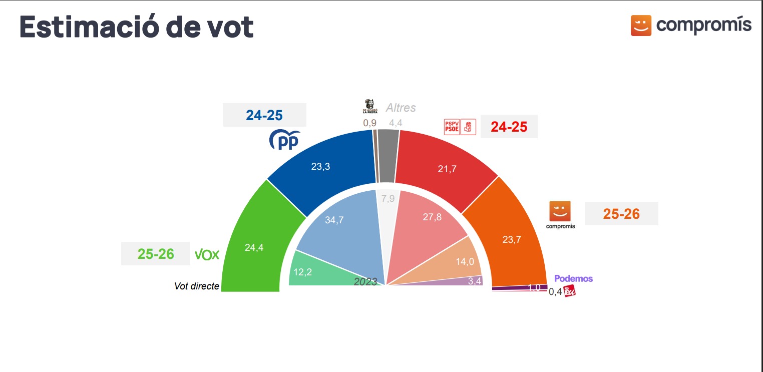 Según el estudio, realizado entre el 9 y el 19 de diciembre de 2025 sobre una muestra de 1.025 personas, Vox obtendría un 24,4% de los votos, seguido muy de cerca por Compromís (23,7%), el Partido Popular (23,3%) y el PSPV-PSOE (21,7%). El sondeo tiene un margen de error de ±3,1%