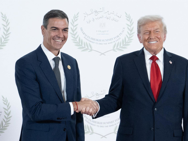 El presidente del Gobierno, Pedro Sánchez (i) saluda al presidente de Estados Unidos, Donald Trump (d), antes de la ceremonia de firma del plan de paz para Oriente Próximo, a 13 de octubre de 2025, en Egipto. Pool Moncloa/Borja Puig de la Bellacasa