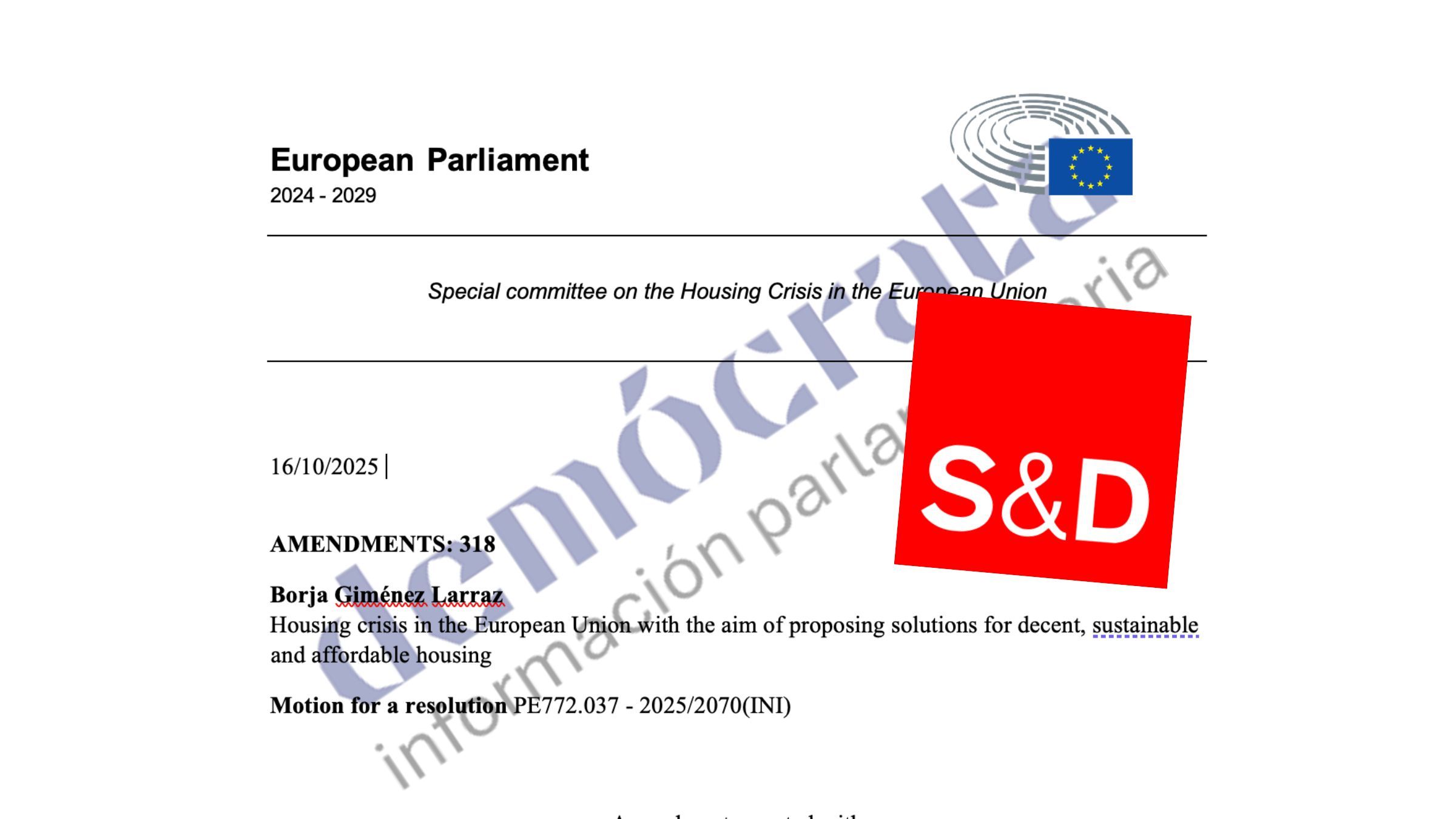 La Comisión Especial de Vivienda del Parlamento Europeo lleva meses trabajando en un informe, que está previsto que se apruebe durante la primera mitad de 2026. Esta semana se ha cerrado el plazo para que los diferentes grupos políticos presentaran sus enmiendas al documento. En esta fase inicial de las conversaciones, Demócrata ha tenido acceso a las enmiendas que las distintas formaciones han registrado.