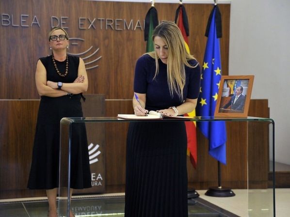 Blanca Martín y María Guardiola, presidentas de la Asamblea y de la Junta de Extremadura, respectivamente, han inaugurado este espacio conmemorativo, siendo las primeras en registrar sus condolencias.