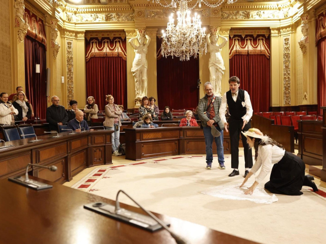 A lo largo de seis pases celebrados durante el fin de semana, unos 300 ciudadanos han podido disfrutar de “El grat deute”, de la compañía Ovnipresents. La obra recrea un episodio histórico sucedido cuando el inmueble albergaba el Círculo Mallorquín: los preparativos de la visita del rey Alfonso XIII a Mallorca y al propio Círculo en 1904.