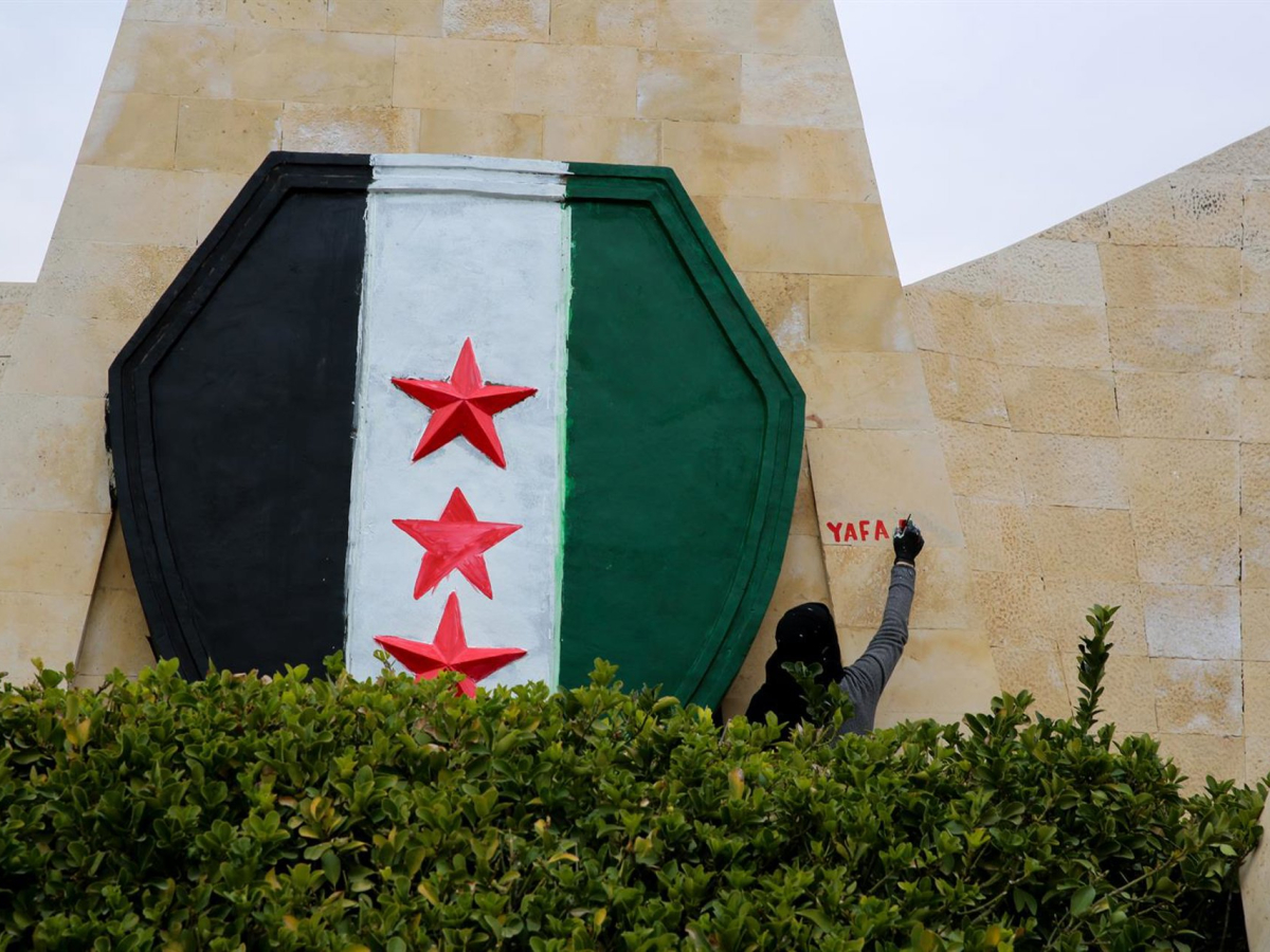 Nueva bandera siria pintada sobre la fachada de un edificio en Hama, en el oeste de Siria Europa Press/Contacto/Juma Mohammad