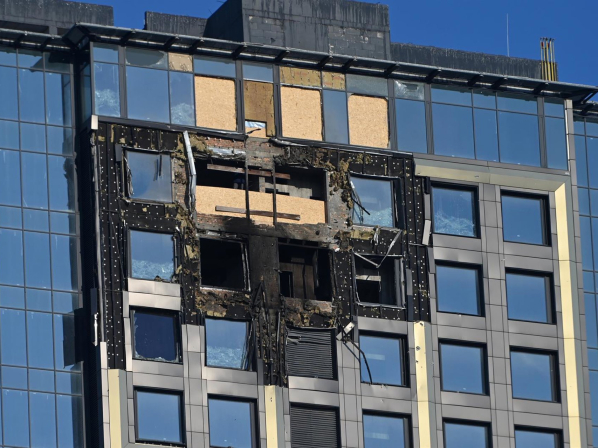Entre las infraestructuras dañadas figuran un edificio de oficinas y varios garajes, que comenzaron a arder tras los impactos. La caída de escombros provocó además el incendio de un camión cisterna de combustible que se encontraba estacionado en un aparcamiento.