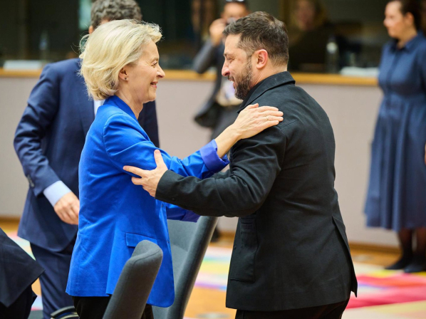 El presidente Volodímir Zelenski (d) estrecha la mano de la presidenta de la Comisión Europea, Ursula von der Leyen, durante la Cumbre en el edificio del Consejo Europeo en Bruselas. Dati Bendo/European Commission/d / DPA