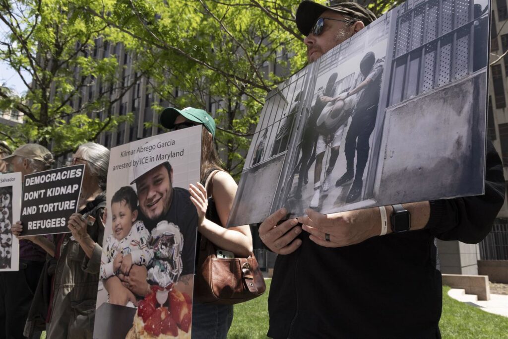 Archivo - Manifestantes del grupo activista Rise and Resist sostienen carteles con imágenes de presos en el CECOT y con el mensaje Kilmar Abrego García arrestado por el ICE en Maryland, junto con una imagen de él sosteniendo a su hijo.Europa Press/Contacto/Gina M Randazzo - Archivo