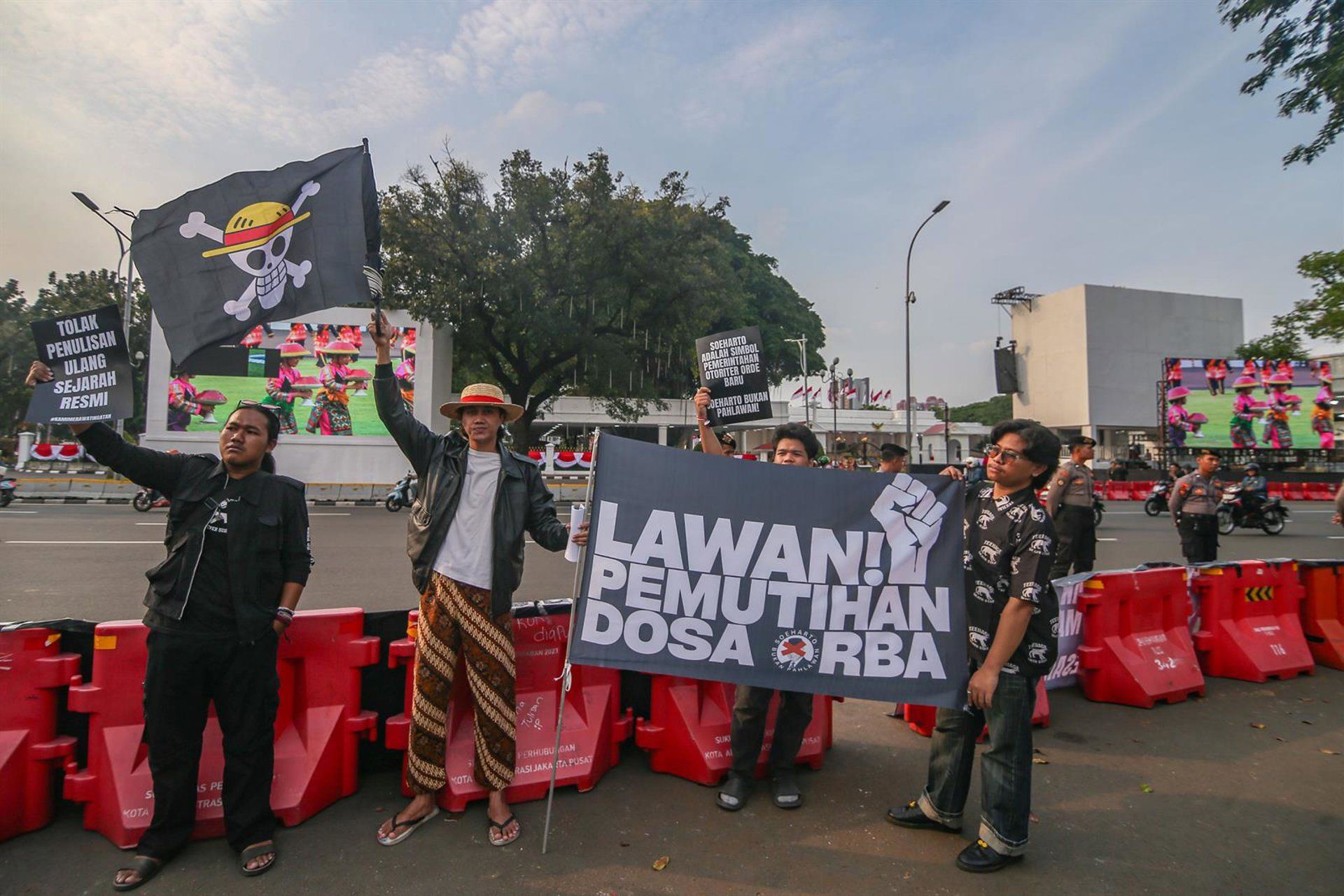 En la manifestación, los participantes llevaron pancartas y banderas de Indonesia, además de la conocida bandera pirata de la serie ‘One Piece’, que se ha convertido en un ícono de las protestas recientes.