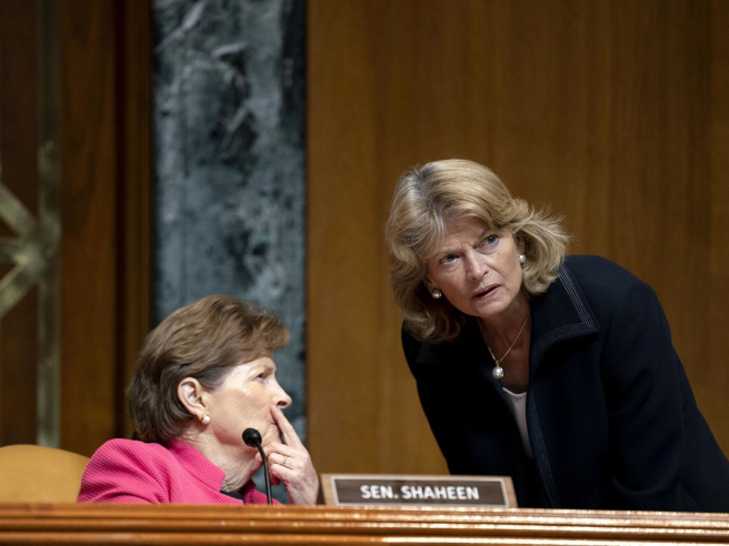 La senadora republicana Lisa Murkowski (en pie, a la derecha) y la demócrata Jeanne Shaheen (izquierda) conversan en una sesión del Senado de Estados Unidos Europa Press/Contacto/Stefani Reynolds - Pool Via