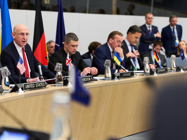 John Healey (Ministro de Defensa, Reino Unido), Mykhailo Fedorov (Ministro de Defensa, Ucrania), Boris Pistorius (Ministro de Defensa, Alemania) y el Secretario General de la OTAN, Mark Rutte. OTAN