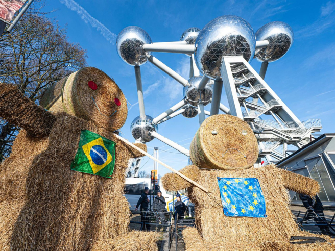 Dos muñecos de paja con las banderas de Brasil y la Unión Europea en una protesta frente al Atomium de Bruselas contra el acuerdo comercial con Mercosur Europa Press/Contacto/Emile Windal