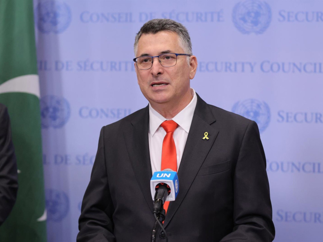 El ministro de Exteriores israelí, Gideon Saar, en declaraciones desde Nueva York durante la Asamblea General de la ONU.  Europa Press/Contacto/Luiz Rampelotto/Europanewswi