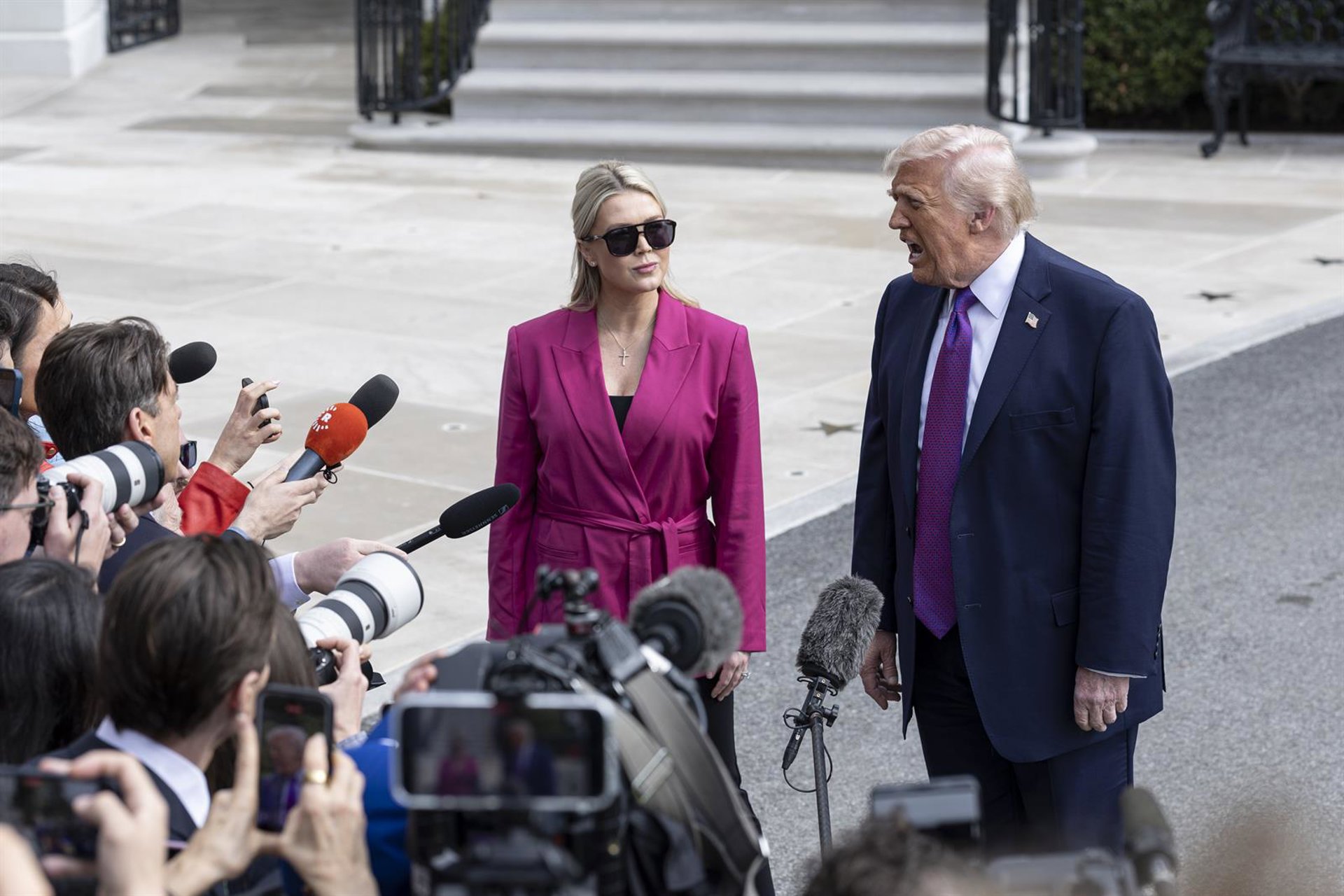 El presidente de Estados Unidos, Donald Trump, habla con los periodistas junto a la secretaria de prensa de la Casa Blanca, Karoline Leavitt, antes de abordar el Marine One en el jardín de la Casa Blanca. Europa Press/Contacto/Mehmet Eser