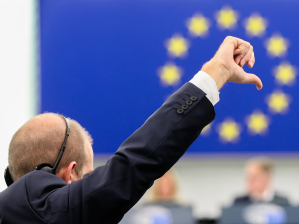 Un eurodiputado indica el voto en contra de su grupo en la sesión de votación del pleno del Parlamento Europeo en Estrasburgo (Francia). ALAIN ROLLAND