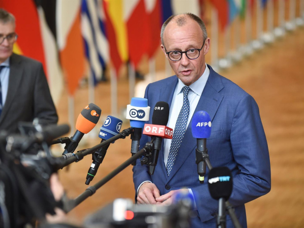 El canciller alemán, Friedrich Merz, atiende a los medios antes de acudir a la cumbre del Consejo Europeo GAETAN CLAESSENS