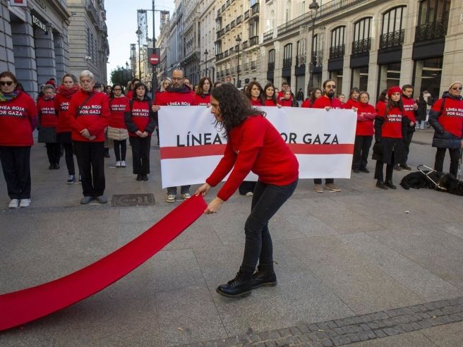 En un acto simbólico en la Puerta del Sol de Madrid, activistas de quince colectivos han trazado una ‘línea roja por Gaza’ para señalar las continuas violaciones al derecho internacional humanitario por parte de Israel, a pesar de la tregua vigente. Los manifestantes, ataviados con indumentaria roja, han exigido a la comunidad internacional y al gobierno español intensificar las presiones para asegurar un incremento sustancial y sin obstáculos de la ayuda humanitaria en Gaza, además de protección real para los civiles, más evacuaciones médicas y el establecimiento de una paz duradera, informó Amnistía Internacional.