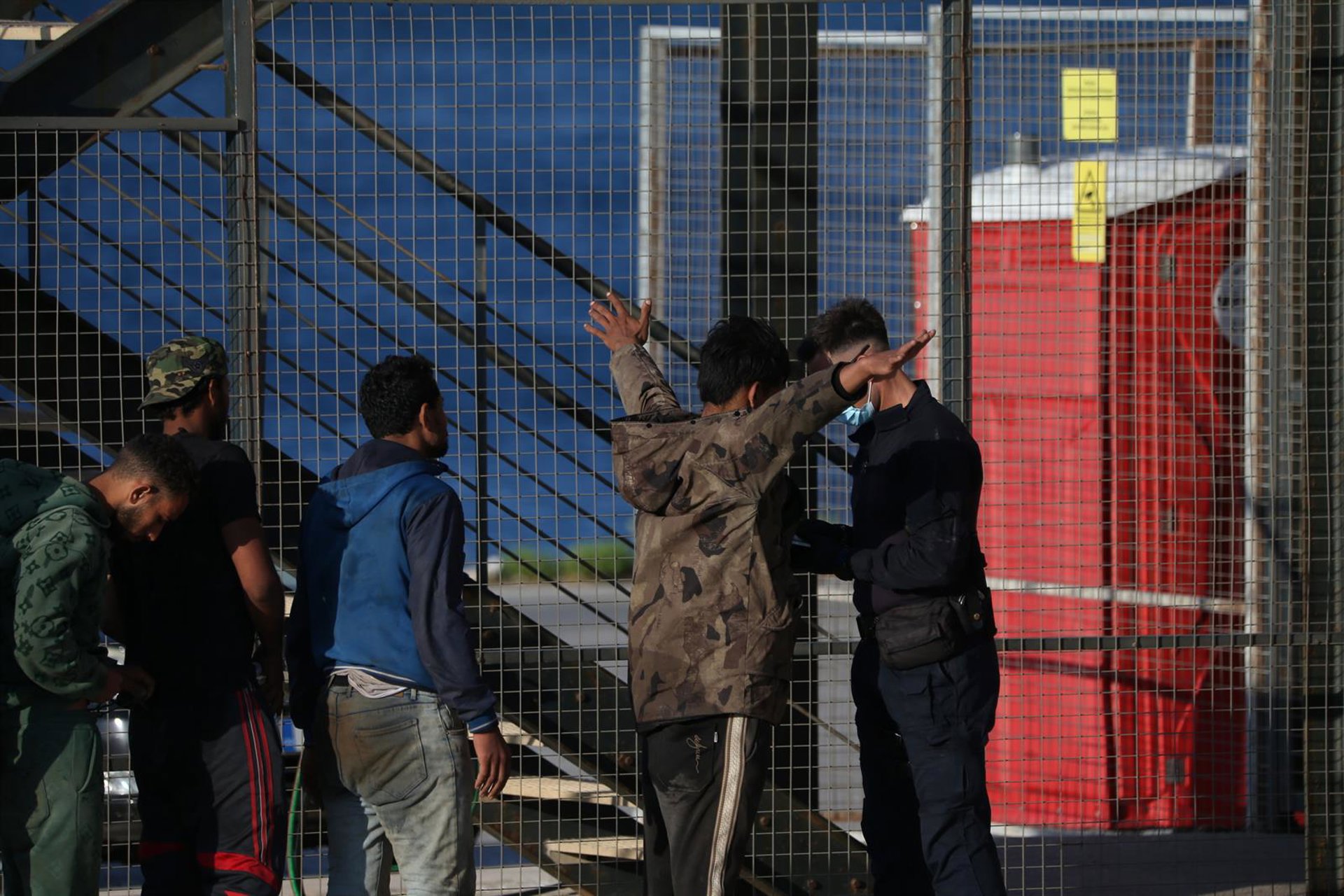 Un guarda costero cachea a una persona migrante rescatada cerca de Creta y desembarcada en el puerto de Lavrio, en Atenas Europa Press/Contacto/Aristidis Vafeiadakis