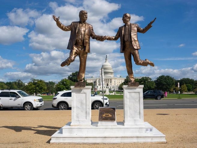 Una escultura de tono bronce que representa al presidente de Estados Unidos, Donald Trump, estrechando la mano con el difunto magnate y condenado por delitos sexuales, Jeffrey Epstein, ha sido reinstalada frente al Capitolio después de que fuera retirada la semana anterior por autoridades de EE. UU.
