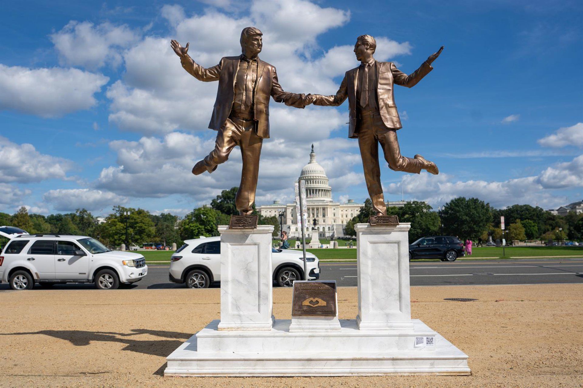 Una escultura de tono bronce que representa al presidente de Estados Unidos, Donald Trump, estrechando la mano con el difunto magnate y condenado por delitos sexuales, Jeffrey Epstein, ha sido reinstalada frente al Capitolio después de que fuera retirada la semana anterior por autoridades de EE. UU.