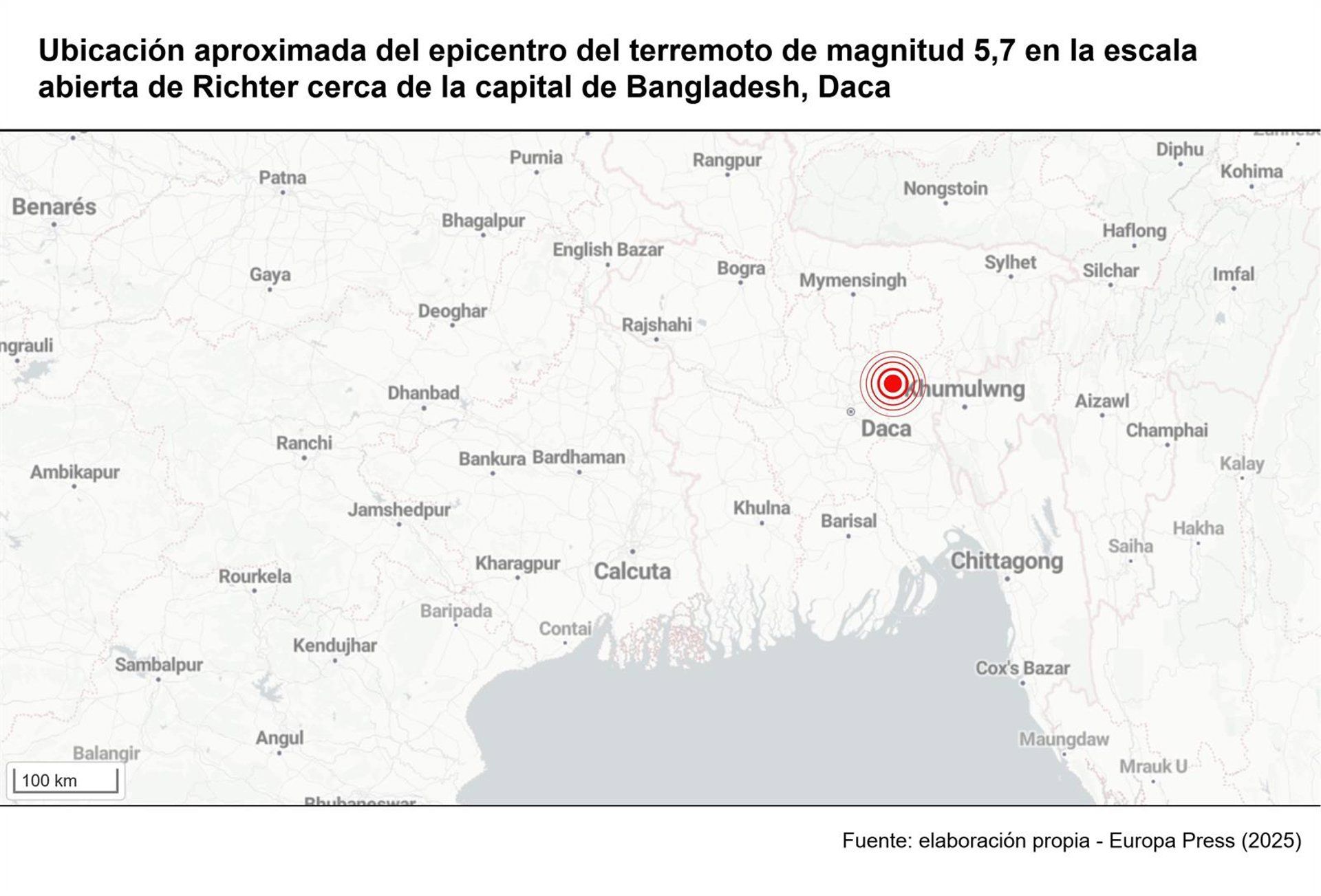 Cinco personas han perdido la vida y aproximadamente un centenar han sufrido heridas debido a un terremoto de magnitud 5,7 en la escala de Richter que se produjo este viernes cerca de Daca, la capital de Bangladesh, y otras áreas circundantes, como han confirmado fuentes oficiales.